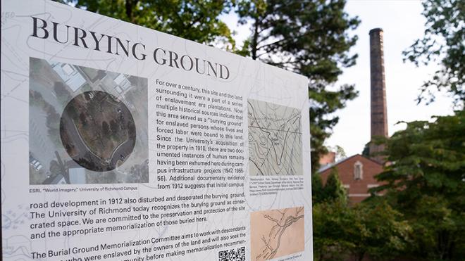 An informative sign with a QR code links to a research report by Lauranett Lee, a public historian and UR professor leading the historical research, and Shelby Driskill, a UR graduate researcher, who have explored the reported enslaved burial ground on campus. Their research has been studied in numerous classes and discussed in various open forums across campus, including as part of first-year orientation.
